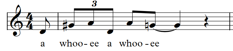 Then I definitely went on a wild hair. I put in the two measures of that little pop blues from 1941, Blues In the Night (My Momma Done Told Me), by Johnny Mercer and Harold Arlen, to see what would happen. The two measures were from the train whistle part of the chorus — “a whoo-ee, a whoo-ee” where the melody jumps a tritone and slides to the fifth, then back to the fourth on the second “whistle”. It follows the same motive as the opening to Bernstein’s “Maria.”