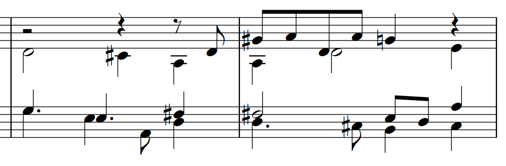 The original motive has a pick-up eighth notes leading to a triplet figure. I couldn’t notate the triplet in the doodle so I was stuck with 8th notes. I wanted to see what it would do if I forced a pick-up, so I made the 8th note pick up at the end of the first measure. Then hit “harmonize” and let it go to town. The AI doodle went nuts! It couldn’t parse the pick-up so it wrote a bunch of notes to lead into my motive. So I could share it, I wrote it into my notation program, imported as a png graphic below.