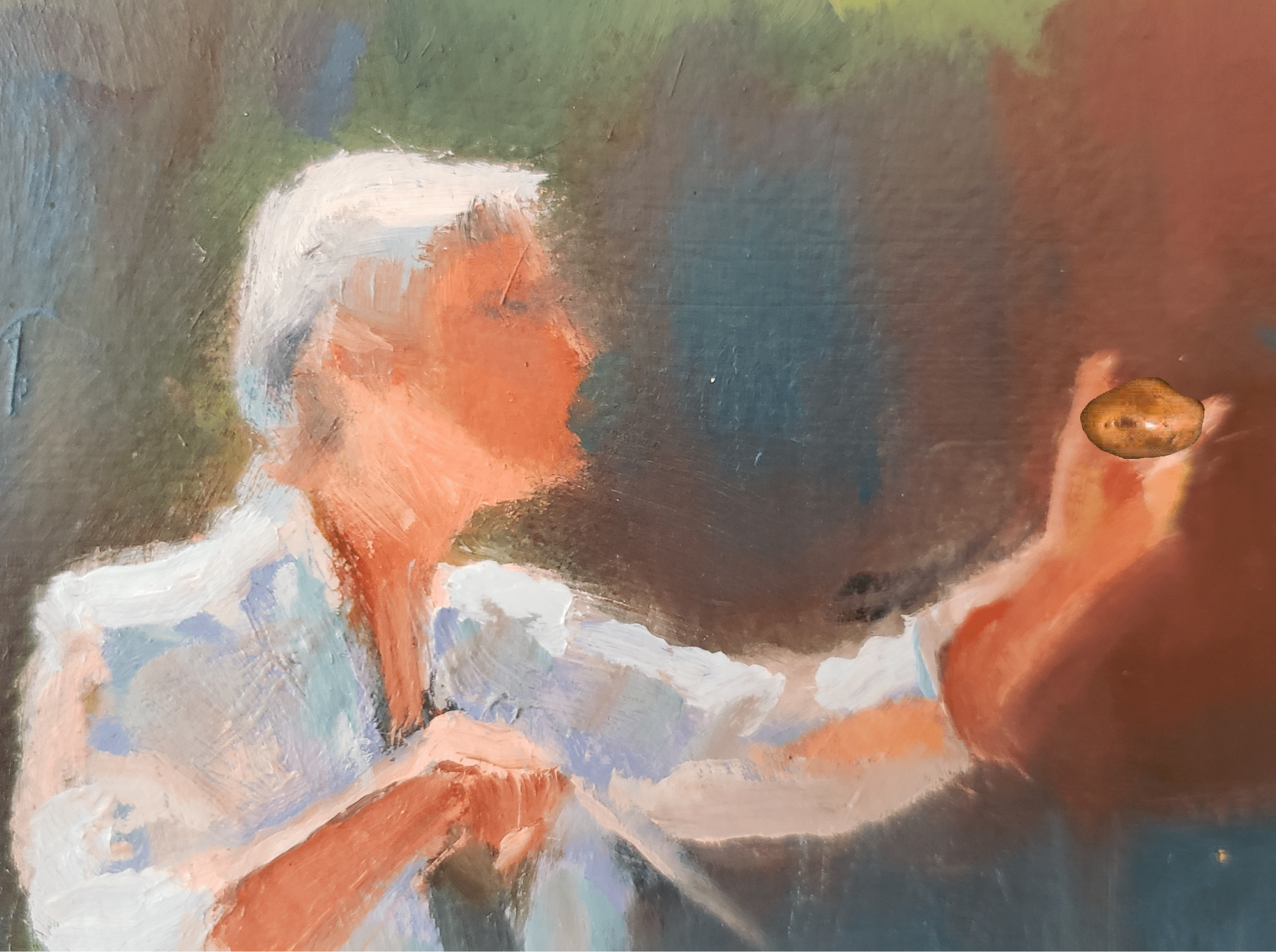 Digging potatoes is the reverse of planting, but it’s a dirty, sweaty job in August. You scoop up the mulch into the wheelbarrow, and it’s multiple loads because there are about three layers of mulch that have built up over the season. Then open the trench around the sides away from the plant so you don’t break what you can’t see — tender new potatoes. Push the dirt back away from the planted part of the row, letting it run through your fingers to catch the little bitty spuds that are great in roasted root veggies. Put the potatoes in a bucket (later, you spread the potatoes out in the sun to “cure,” never washing them until just before you cook them). I worked this way down the entire row of Yukon Gold potatoes, then started on the Norland Reds.