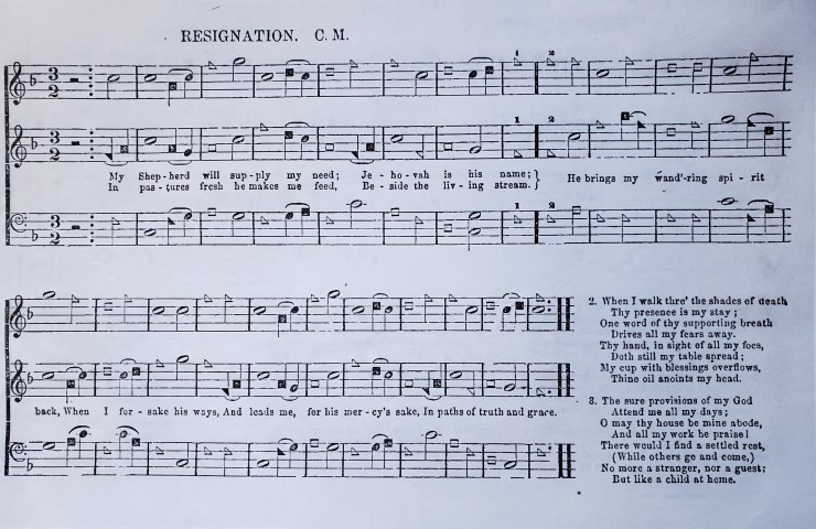 The image at the top is from Southern Harmony, and Musical Companion, a shape note hymn and tune book compiled by William Walker, first published in 1835. The tune is more familiarly sung as “My Shepherd Shall Supply My Need.” The different shaped notes are typical of the way singing masters adapted Solfege to differently shaped notes to aid in learning to read the song.